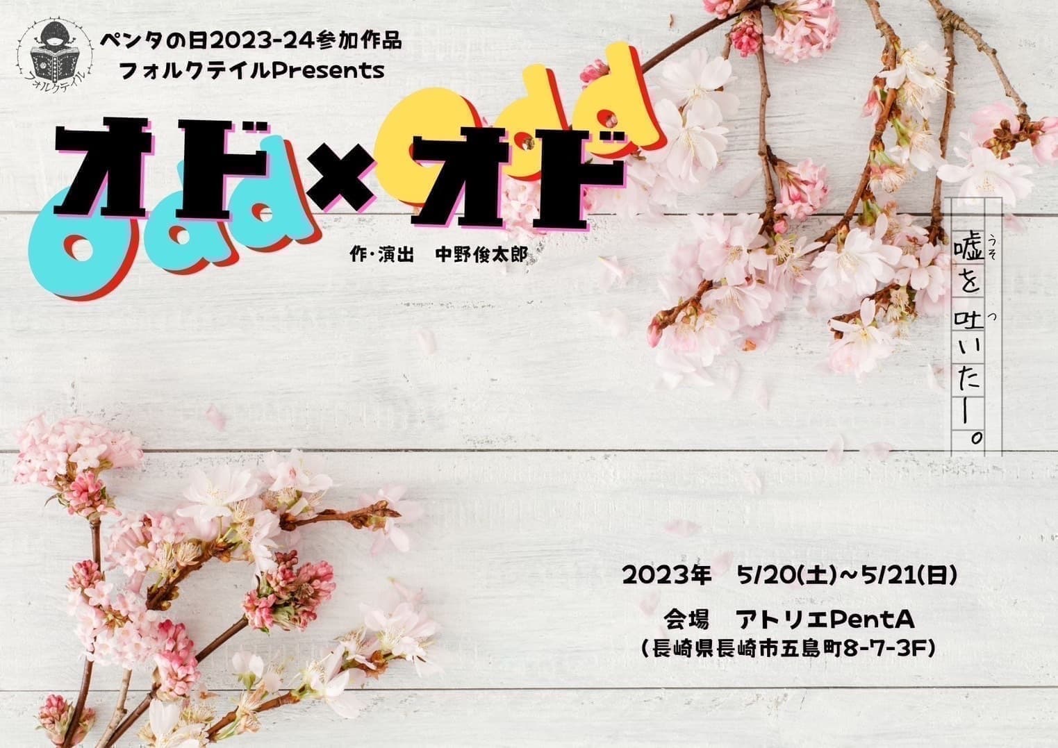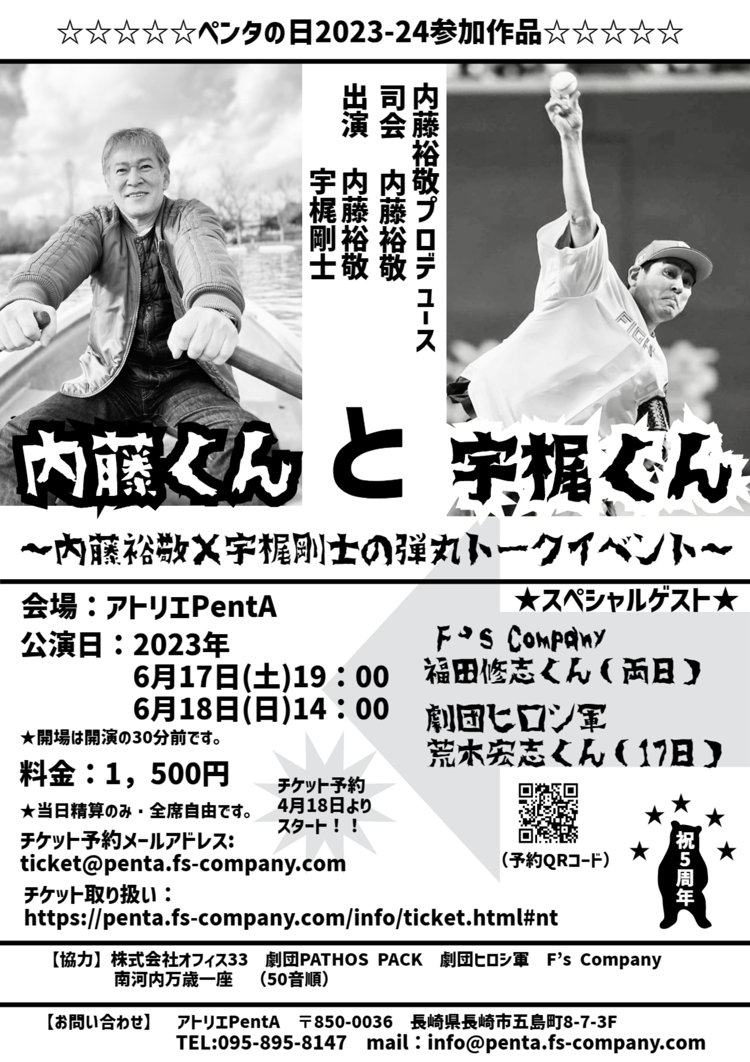 35年来の仲間である、内藤裕敬(南河内万歳一座座長)と宇梶剛士(劇団PATHOS PACK主宰)が、二人の演劇体験を振り返ると共に、長崎との関わりを含め、アトリエPentAの5周年をお祝いに駆けつけます。昨年、宇梶が立ち上げた劇団600歳の会に新作「迷惑な季節」を提供した内藤との製作の裏話しから、稽古のエピソード、長崎で活躍するフーズカンパニーの福田君や劇団ヒロシ軍の荒木君をゲストにパワフルに語りつくす、オッサン二人と長崎と演劇の一時間半をお楽しみください。